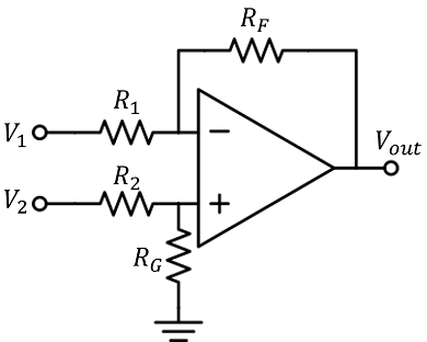 V1=5 V, V2=-6,5 V, R1=33 kΩ, RF=30 kΩ, R2=30 kΩ, RG=15 kΩ