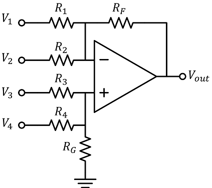 V1=7,5 V, V2=-7,5 V, V3=-5 V, V4=6,5 V, R1=16 kΩ, R2=18 kΩ, R3=33 kΩ, R4=27 kΩ, RF=51 kΩ, RG=11 kΩ