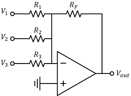 V1=-3 V, V2=7,5 V, V3=1 V, R1=20 kΩ, R2=30 kΩ, R3=33 kΩ, RF=36 kΩ,