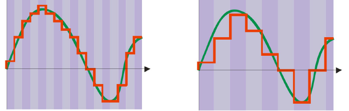 On enregistre le même signal audio (en vert) avec deux enregistreurs différents, qui me donnent chacun un signal (en rouge). Quelle différence y a-t-il entre l'enregistreur de gauche et celui de droite ?