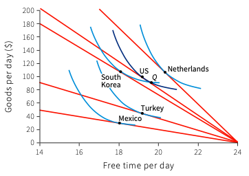 Le tableau suivant montre les heures de temps libre et de consommation par jour dans cinq pays différents en 2013. Le diagramme ci-dessous montre ces données, ainsi que des courbes d'indifférence hypothétiques. Sur la base de ces informations, laquelle des affirmations suivantes est correcte?
