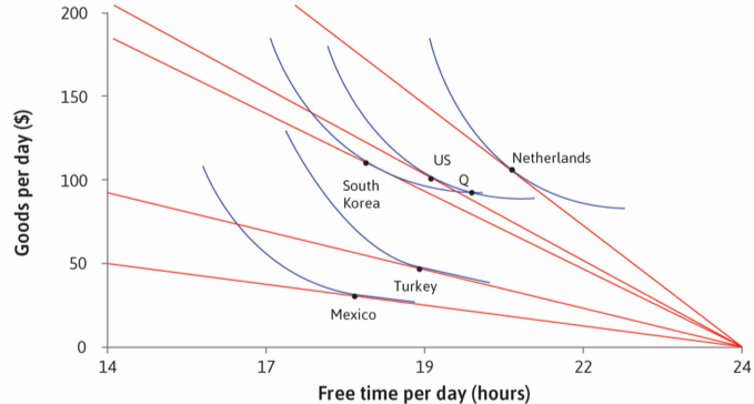 Le chiffre suivant montre un modèle de temps libre et de consommation par jour dans tous les pays en 2013. Supposons que les ressortissants des États-Unis et de la Turquie ont les mêmes préférences (le même ensemble de courbes d'indifférence) et ceux du Mexique et des Pays-Bas ont les mêmes préférences. D'après les informations fournies, nous pouvons conclure que: