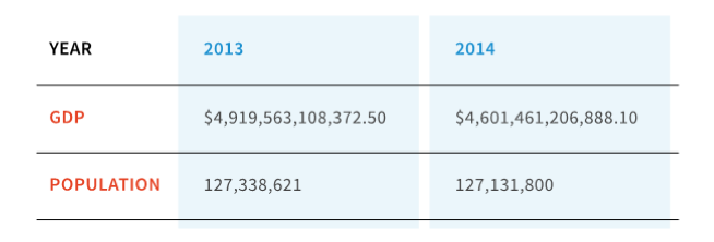 Le tableau suivant montre le PIB nominal (en dollars américains 2015) et la population du Japon en 2013 et 2014 (source: la Banque mondiale). Sur la base de ces informations, lequel des énoncés suivants concernant le PIB par habitant est correct?