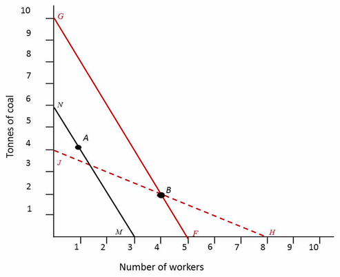 La technologie A utilise 1 travailleur et 4 tonnes de charbon, tandis que la technologie B utilise 4 travailleurs et 2 tonnes de charbon.
