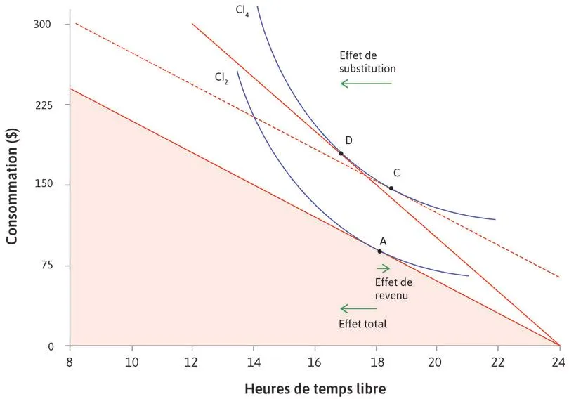 Dans la décomposition d'une hausse de salaire en effets de revenu et de substitution (Figure suivante), le passage du point A au point C représente l'effet de revenu. Comment ce point C est-il construit ?