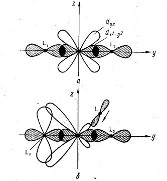 Ліганд L1 має заповнену орбіталь, що здатна до π -взаємодії із незаповненою dyz- орбіталлю. Внаслідок утворення π - зв’язку електронна хмара dyz-орбіталі частково передається на орбіталь ліганду, в результаті чого електронна хмара цієї орбіталі центрального атома зміщується в бік ліганду L1. Ліганд L взаємодіє з орбіталлю і на початку зміщує ліганд. Якщо інтенсивність взаємодії нового ліганду L з орбіталлю є достатньо сильною, то цей ліганд повністю витісняє ліганд L2 займаючи його місце.