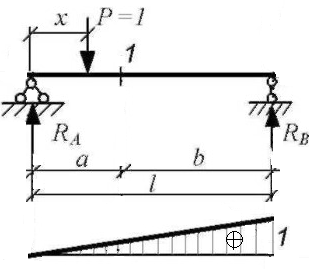 Графік, який відображає зміну даного зусилля (переміщення) у даному перерізі при переміщенні вантажу Р=1 по споруді, називається