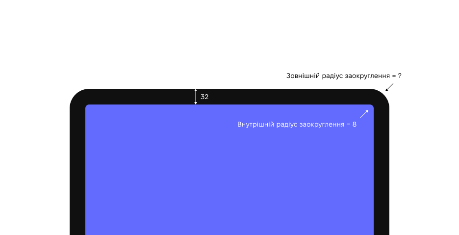 Яким має бути зовнішній радіус заокруглення компонента, якщо внутрішній радіус дорівнює 8 px, а padding — 32 px?