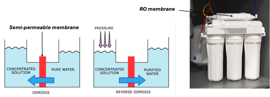 Prerna reaches her hostel and looks at the water filtration units installed along the floor. The key component of the water filtration units include a Reverse Osmosis (RO) membrane, which similar to cell membrane is semi-permeable. The RO membrane requires electricity to supply the external pressure to push water against the osmotic gradient. Based on the following figure, which of the following statements correctly distinguish reverse osmosis (RO) from osmosis?