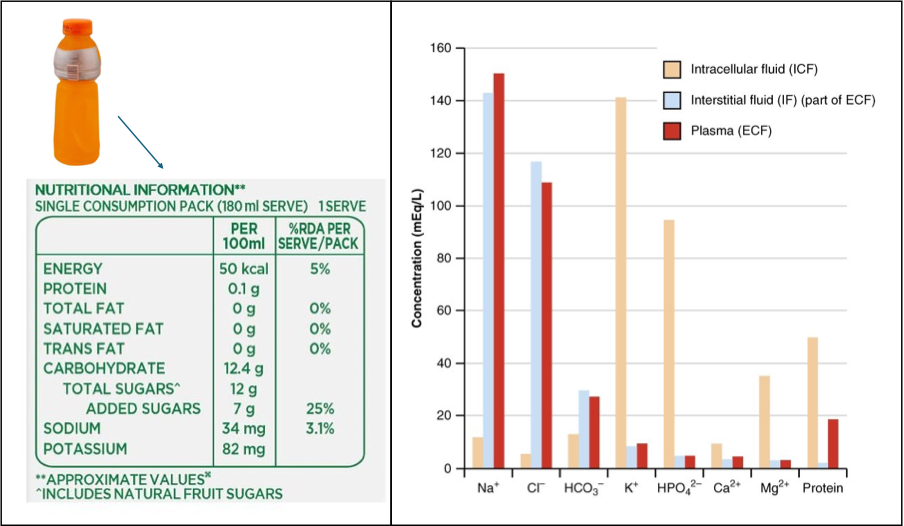 The following figure shows the nutritional information of the fruit juice. Assume that the primary contributors for the osmolarity are sodium, potassium and total sugars; the total sugars in the juice are in the form of glucose. Atomic mass of sodium = 23 g/mol, atomic mass of potassium of 39 g/mol, molar mass of glucose = 180 g/mol.