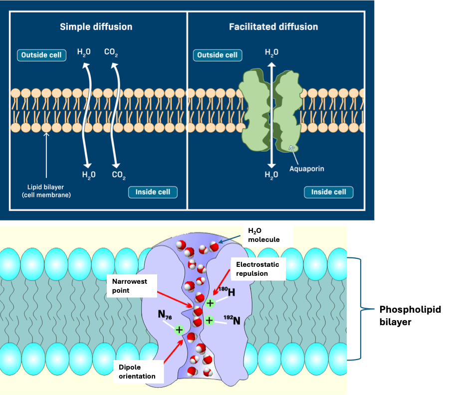 While water molecules can pass through the cell membrane by simple diffusion, the rate of transport is very low. However, this slow diffusion cannot account for the rapid water movement observed in cells. To facilitate efficient water transport, cells rely on a specialized channel protein called aquaporin.
