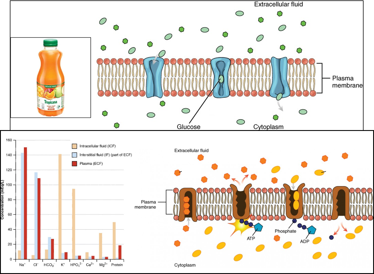 Prerna is drinking a fruit juice which has vitamins, electrolytes, and sugar. The sugar is broken down in our gastro-intestinal (GI) tract into glucose, and this glucose must be transported inside our cells to make energy. Also, the whole action which enables Prerna to perceive the thirst and drink the juice is governed by electrical potentials across neurons, which are dependent on the transport of sodium and potassium ions. Considering the selective permeability of our cell membrane and by looking at the figures, which of the following options are true: