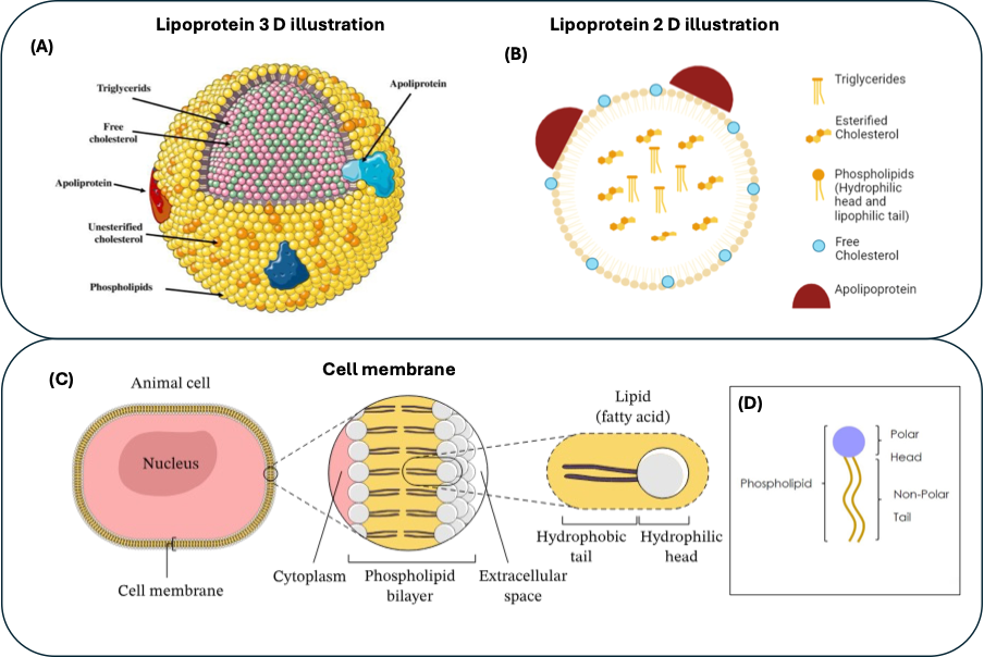Lipoproteins make use of the amphipathic nature of phospholipids, which are also crucial components of the cell membrane. Apolipoproteins are the proteins present in lipoproteins. Choose all the correct answers from the following based on the labels (A,B, C and D) shown in the figure: