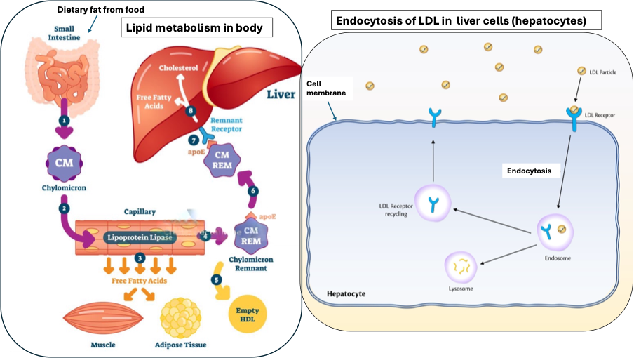 When we eat food, dietary fats are broken down and absorbed in the small intestine. Inside intestinal cells, they are packed into chylomicrons (a type of lipoprotein). Chylomicrons reach the bloodstream where they are broken down. The chylomicron remnants are taken up by the liver via receptor-mediated endocytosis and processed. The liver then synthesizes and releases very-low-density lipoproteins (VLDL), which are converted into LDL in the bloodstream.