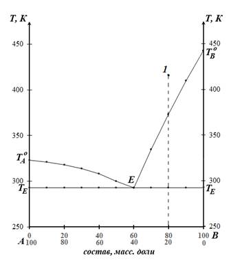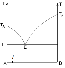 250 г расплава, соответствующего точке 1 на диаграмме, охладили до температуры ТЕ (до начала кристаллизации эвтектики). Рассчитайте массу (г) кристаллов вещества В, образовавшихся к этому моменту.