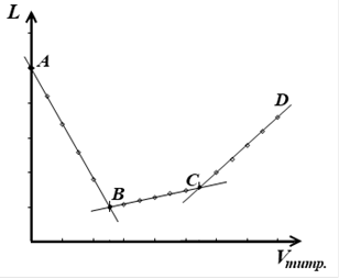 Кривая кондуктометрического титрования смеси соляной и уксусной кислот щёлочью (КОН) имеет вид, представленный на рисунке.