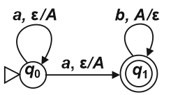 Визначити формальну мову, яку допускає зображений на рисунку МП-автомат.