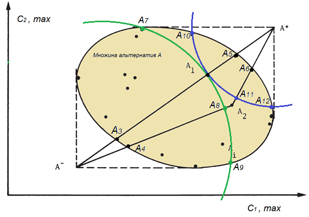 Позначення: зелений колір - коло з центром в т. А- та радіусом А-А1, синій колір - коло з центром в т. А* та радіусом А*А1,