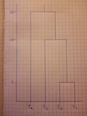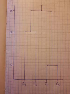 Отримано матрицю відстаней для п’яти об’єктів, які характеризуються двома ознаками, a(1,0), b(0,2), c(3,0), d(2,4), e(3,3):