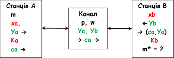 Застосовуючи алгоритм Ель-Гамаль виконати сценарій комунікації між двома станціями А та В, станція А - відправник, станція В - отримувач. Параметри сеансу комунікації : Р=263, w=21, сa=235 -криптограма отримана В, xa=24432 і xb=25528 - секретні ключі відповідно А і В.