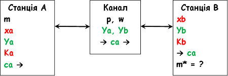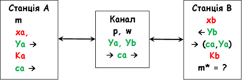 Станція В забезпечує конфіденційність за схемою El Gamal при передаванні повідомлення m до станції А через незахищений Канал. Параметри сеансу комунікації: p=743, w=5. Станція В зашифрувала m своїм ключем К =7 і передала її та публічний ключ =57 через Канал до станції А. Станція А скористалась власним приватним ключем xa = 415 та іншими даними і отримала ключ дешифрування Ка, щоби розшифрувати cb у повідомлення Ка = ? та