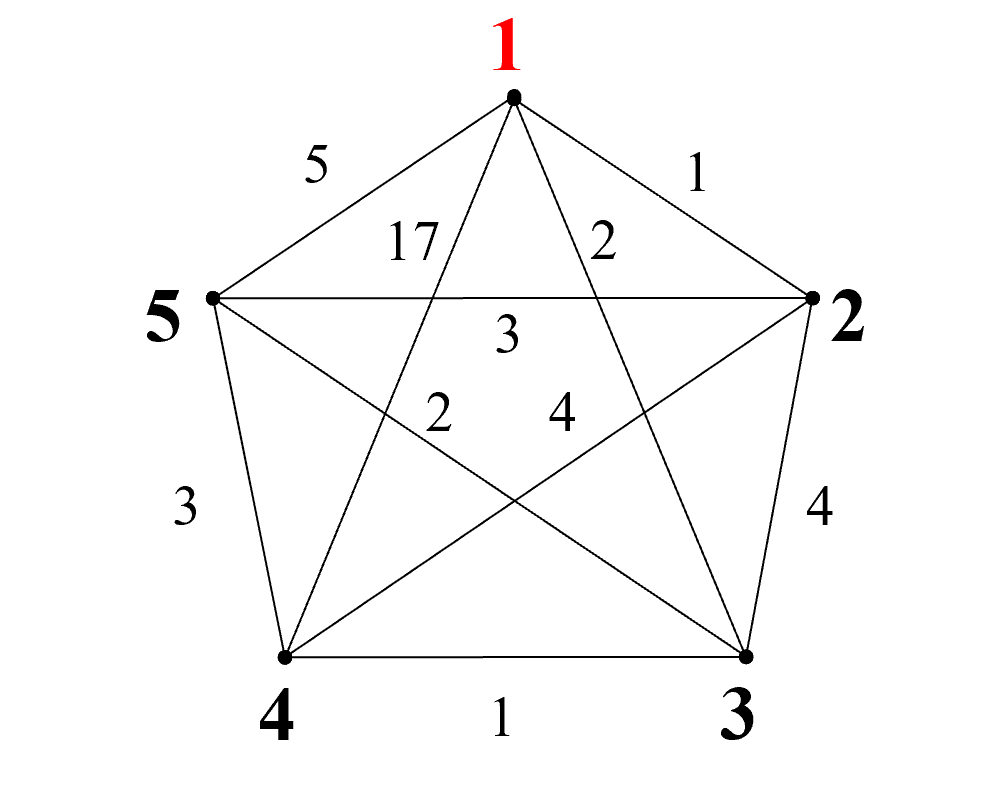 Розрахуйте, за наведеним нижче алгоритмом, найменьшу вартість обходу всіх міст з міста №1 + поверненя в місто №1 (вартість маршрутів між містами наведена на графі) . ( Умовні позначення: ^ знак степеню, * знак множення)
