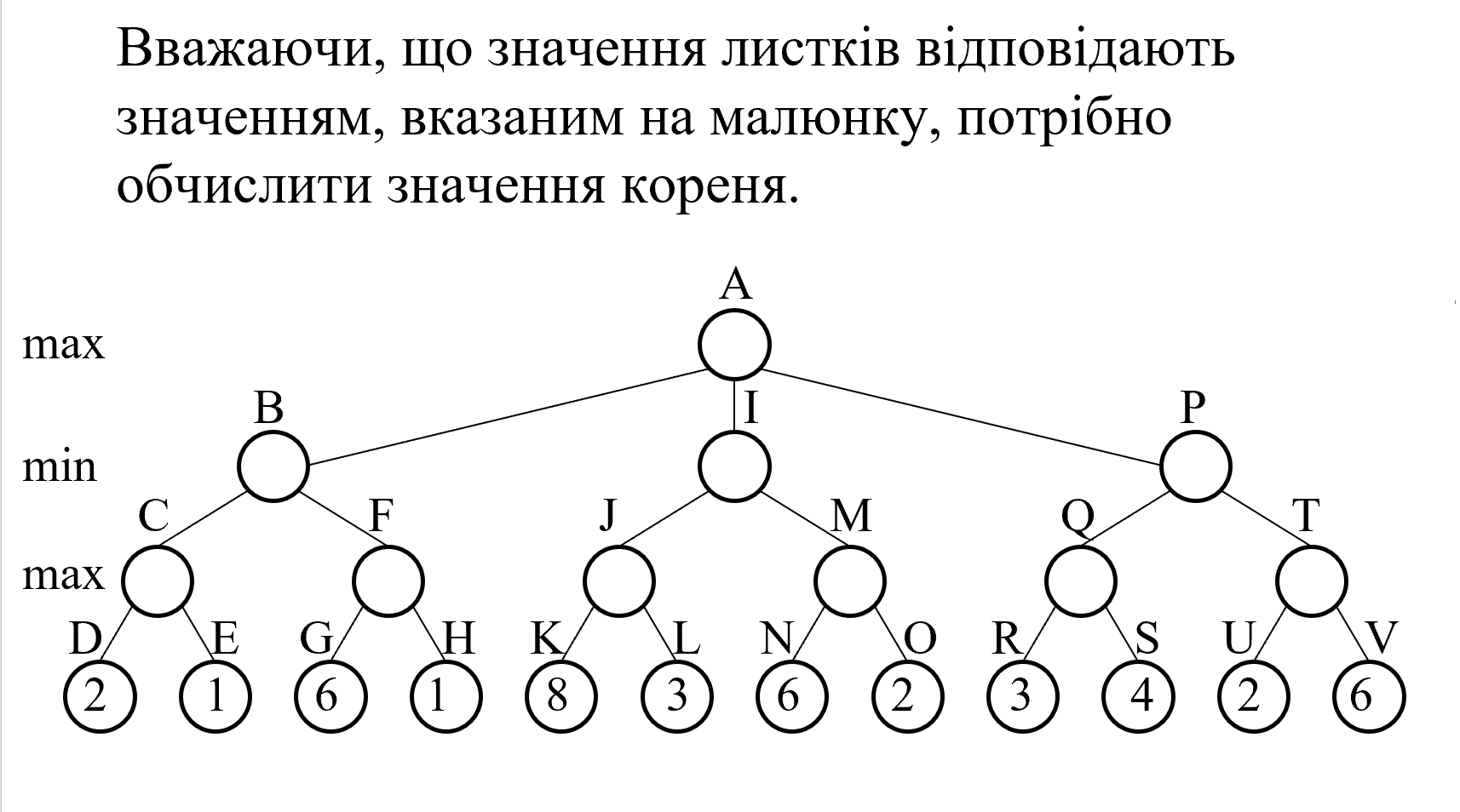Застосуйте метод альфа-бета відсікань, щоб отримати відповідь на поставлену задачу: