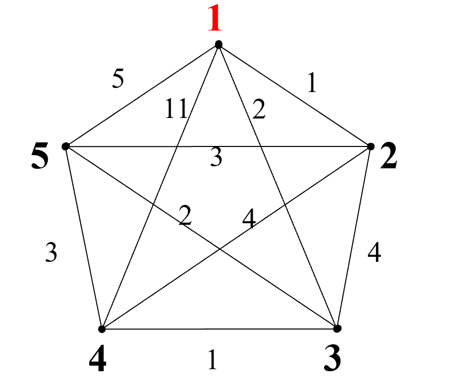 Розрахуйте, за наведеним нижче алгоритмом, найменьшу вартість обходу всіх міст з міста №1 + поверненя в місто №1 (вартість маршрутів між містами наведена на графі) . ( Умовні позначення: ^ знак степеню, * знак множення)