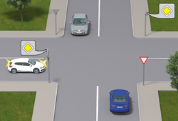 16218. Як повинен вчинити водій синього автомобіля в даній ситуації?