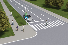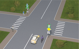 1615. Чи повинен водій синього автомобіля дати дорогу пішоходам, повертаючи праворуч або ліворуч на даному перехресті?