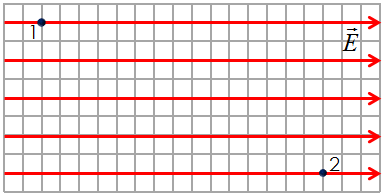 В однорідному електричному полі напруженістю 152 В/м кулька із зарядом 9,9 мкКл перемістилася із точки 1 в точку 2. Визначити роботу електричного поля. Розміри клітинки 5 см × 5 см.