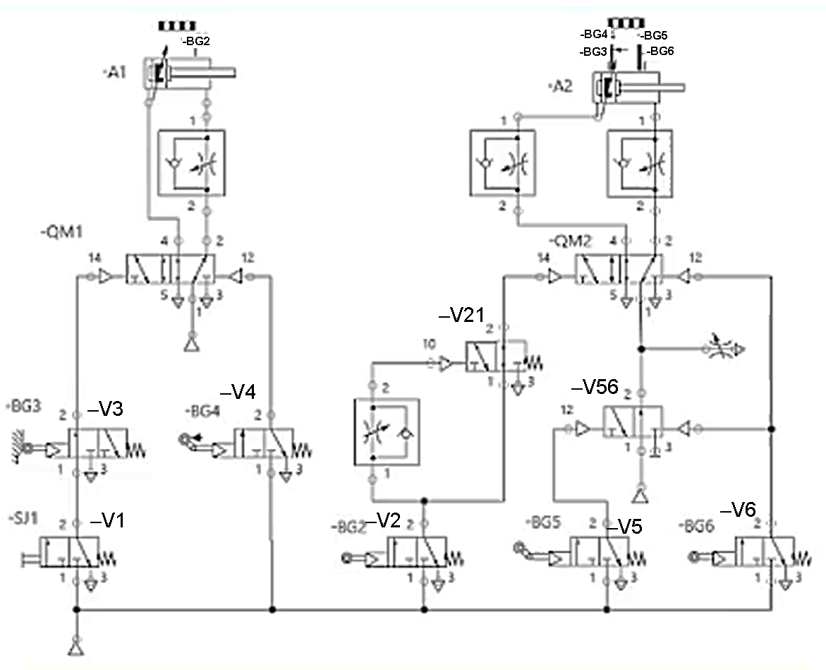 В яких портах розподільника -V21 діє повітря підвищеного тиску при знаходженні поршня виконавчого циліндра –A1 у крайньому правому положенні?