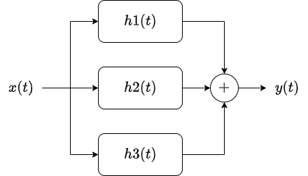 Tenint en compte la figura adjunta, considereu el senyal i que les respostes impulsionals pels subsistemes 1, 2 i 3 es poden expressar com , i , respectivament. Calculeu .
