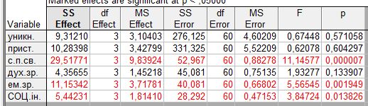 Результати однофакторного дисперсійного аналізу подані в таблиці