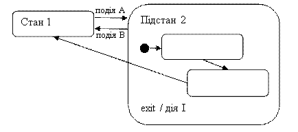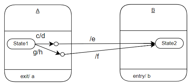 Дано фрагмент діаграми станів. Визначіть послідовність дій, які відбудуться після виконання події c при переході від стану (State1) до стану (State 2). Дії позначаються літерами латинського алфавіту. У відповідь запишіть послідовність літер, розділених символом пробілу, наприклад (d h e).