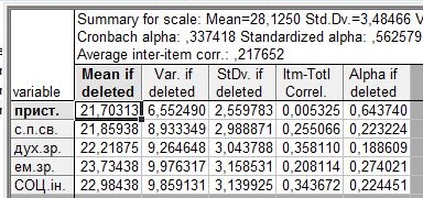 Результати перевірки батареї шкал на надійність за Кронбахом мають вигляд