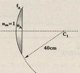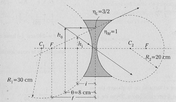 A lente mostrada na figura abaixo é constituída de um material cujo índice de refração é igual a . Sabendo-se que a lente encontra-se imersa no ar, determine a sua distância focal.