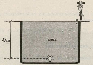 No fundo de uma piscina de profundidade se encontra uma fonte puntual de luz. Qual é a área da mancha luminosa que o menino da figura observa na superfície da água? Sabe-se que o índice de refração da água é .