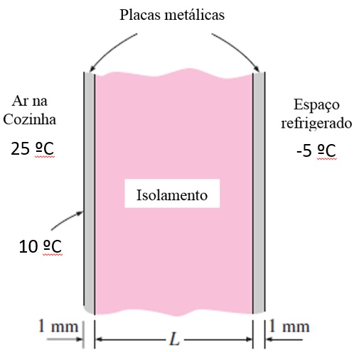 Nota: Pode assumir as resistências térmicas por condução nas placas metálicas desprezáveis, assim como as resistências térmicas de contacto nas faces dos materiais, quando comparadas com as restantes. Assuma transmissão de calor unidimensional e regime estacionário.