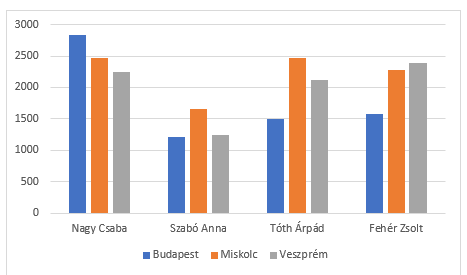 Tekintsük az alábbi diagramot, amely négy értékesítő által, három városban eladott termékek számát szemlélteli. Melyik állítás IGAZ?