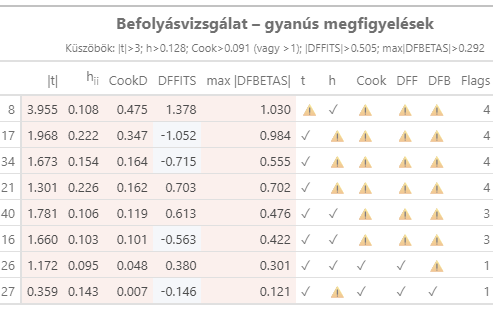 Az lineáris regresszió a korai fázisú vállalkozók arányát (Tea) magyarázza 47 ország adatai alapján. Értékeld röviden a befolyásvizsgálat eredményét!