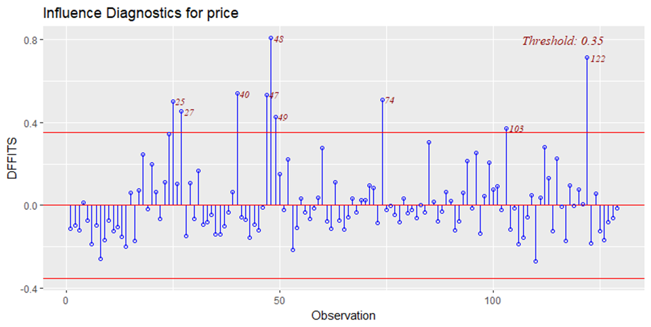 Az alábbi ábra egy OLS modell DFFITS diagnosztikáját mutatja