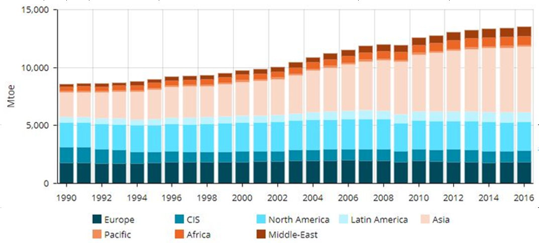 Grafikonelemzéssel válassza ki az igaz állítást az egyes földrajzi térségek energiafelhasználási tendenciáiról!