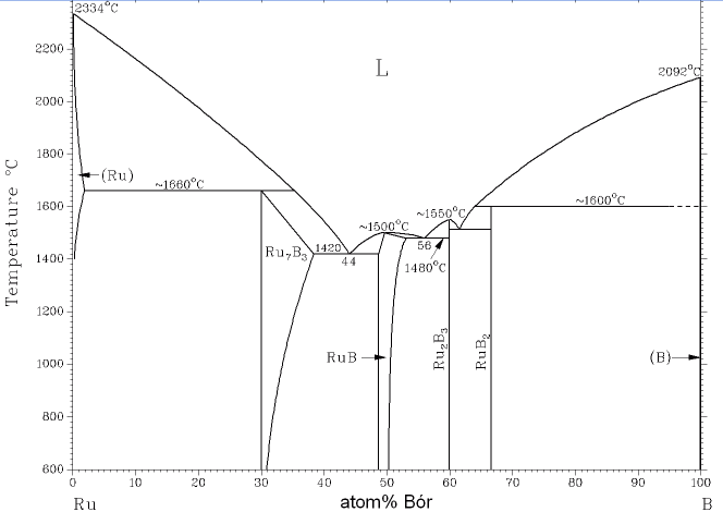 Milyen fázis(ok) található(ak) meg az alábbi fázisdiagram szerinti ötvözetben egyensúlyi körülmények között 1800°C-on 10 at.% B-tartalom mellett? (Alkalmazza a kónódát!)