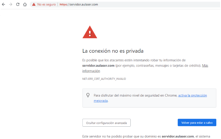 Hemos creado el sitio web servidor.aulaser.com, configurado el SSL y finalmente aparece en el navegador: