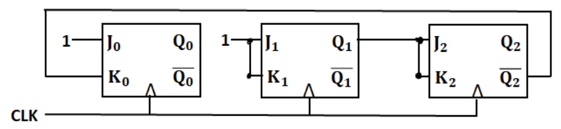 On considère un compteur réalisé avec 3 bascules JK, toutes actives sur le front montant du même signal d'horloge et configurées de la manière suivante :