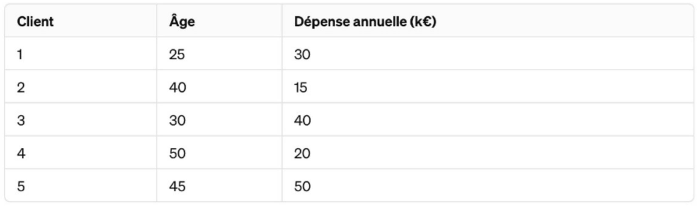 En utilisant l’algorithme des k plus proches voisins (kNN) avec k=3 et la distance de Manhattan, déterminer à quelle classe appartient le client 6 (Age = 35, Dépense annuelle = 25)