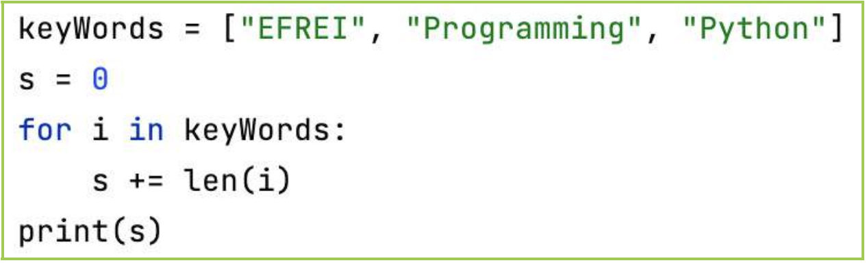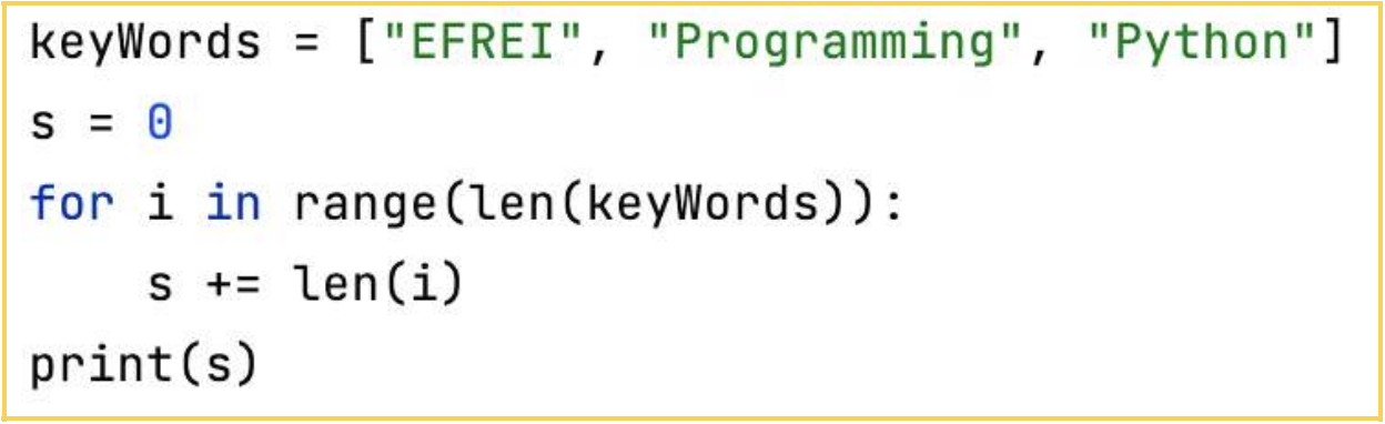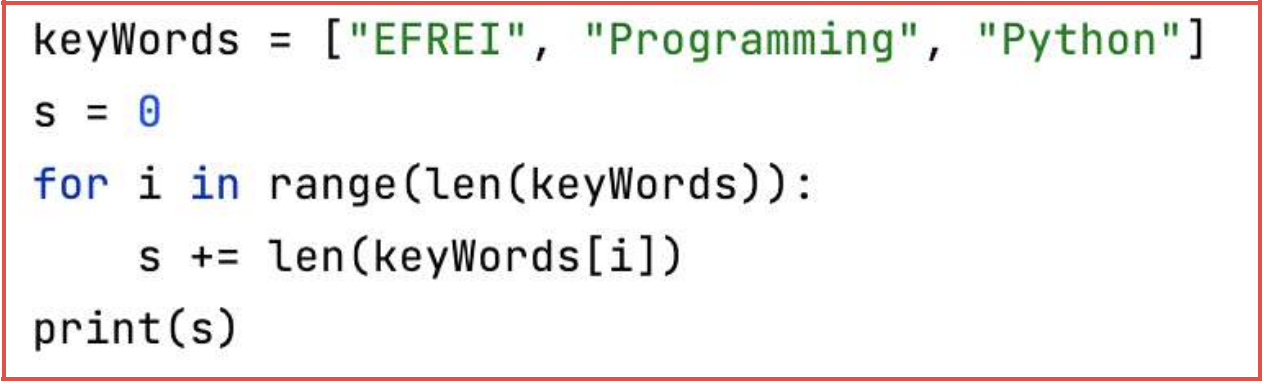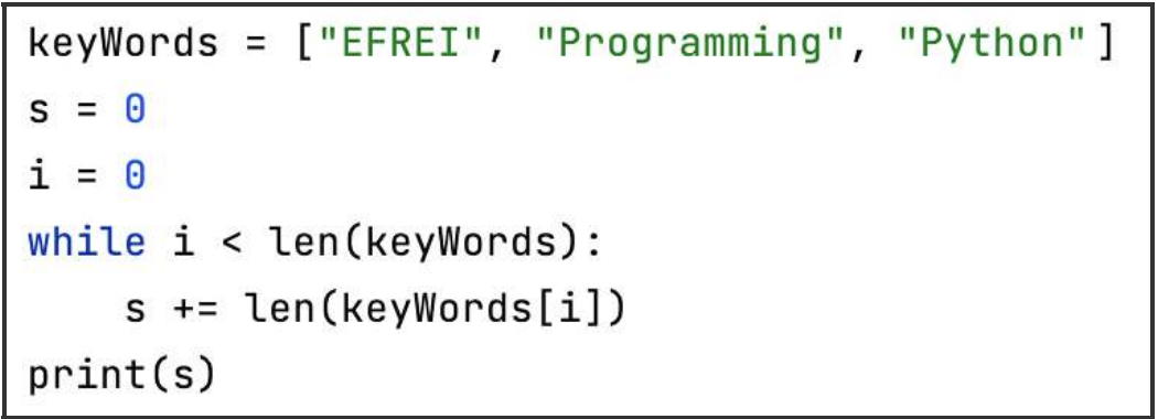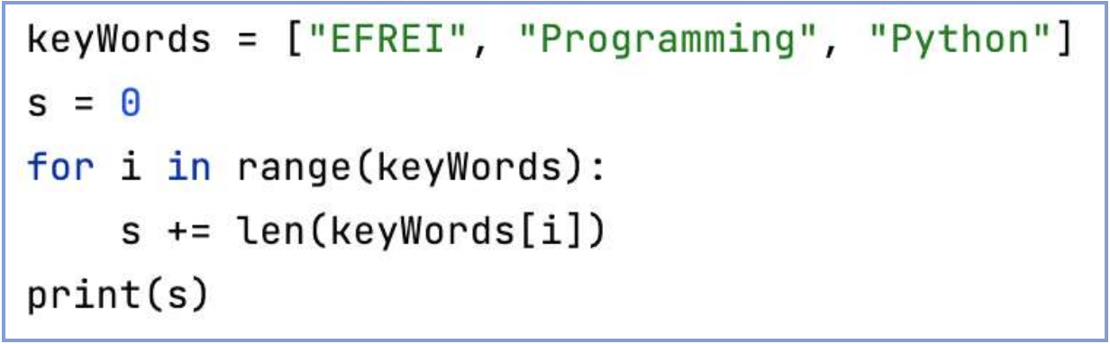 Soit la liste keyWords = ["EFREI", "Programming", "Python"].Parmi les propositions ci-dessous, choisissez un ou plusieurs programme(s) Python qui calculeront la somme des longueurs des éléments de la liste keyWords.