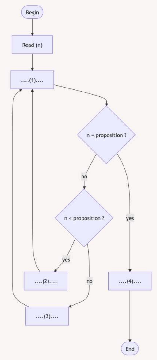 Le schéma suivant décrit un algorithme permettant à Alice et Bob de jouer à ce jeu de devinettes. Complétez-le en associant chaque élément manquant avec les propositions suivantes.
