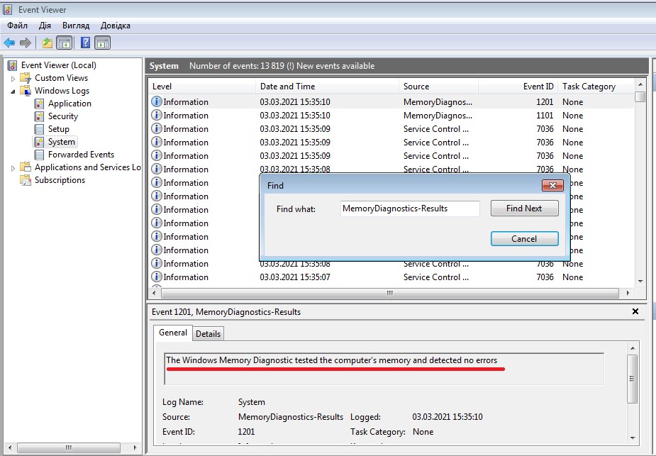 Переглянути результати тестування оперативної пам'яті утилітою Windows Memory Diagnostic Tool можна за допомогою: